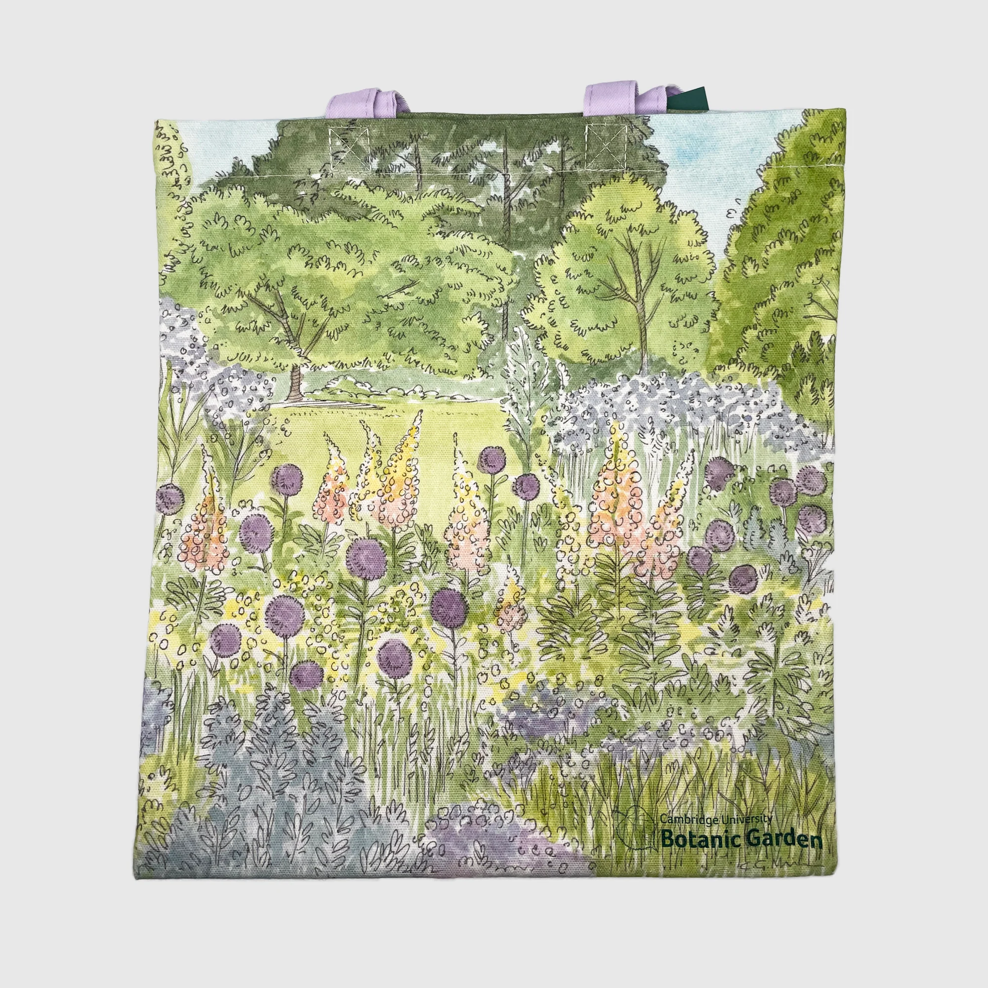 A new tote for garden lovers, featuring a charming and exclusive original illustration by Cambridge artist C.G. Michaels. The bee borders are shown in their summer glory, with alliums, hollyhocks, and the great lawn of Cambridge University Botanic Garden behind.
