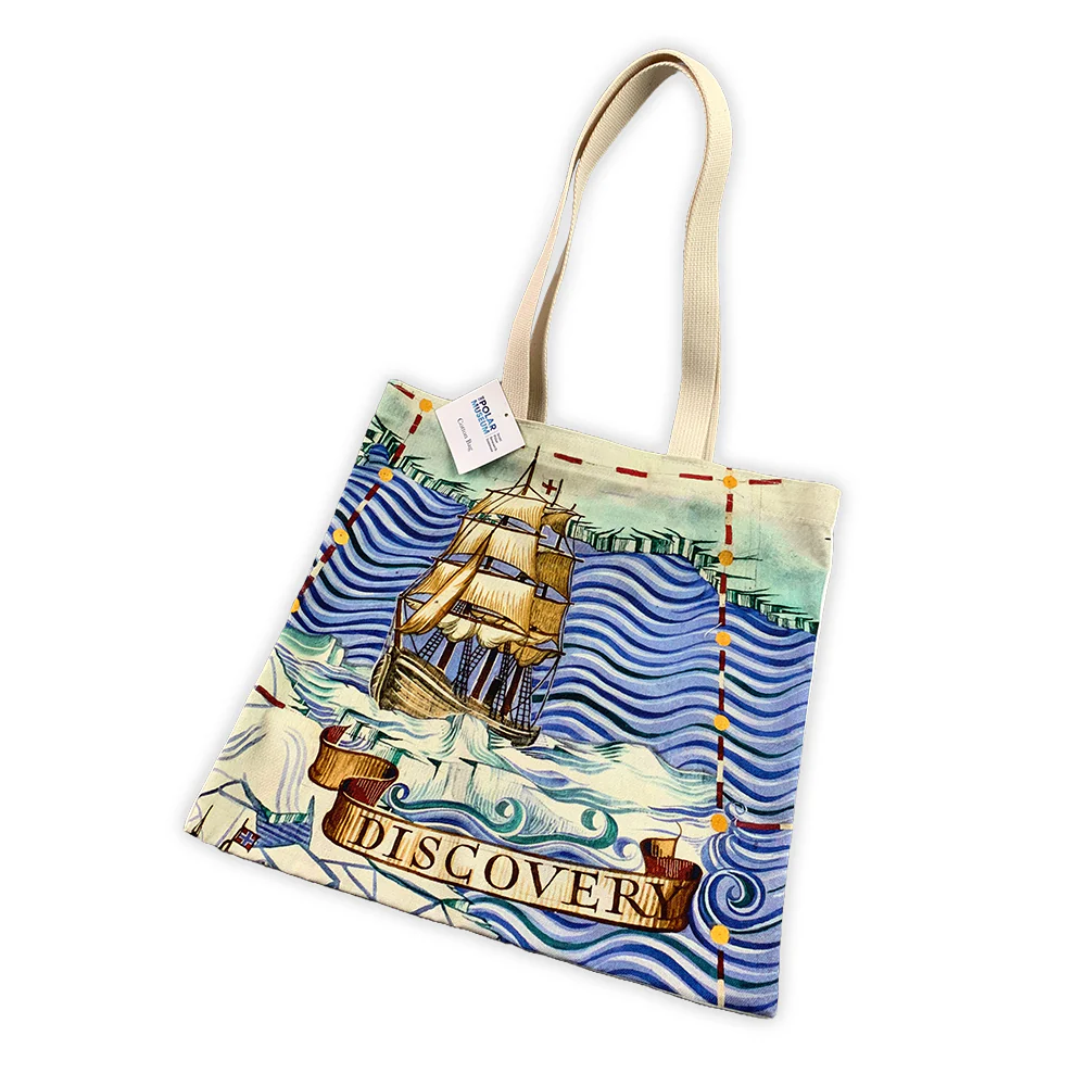 Cotton tote bag featuring a detail of the polar exploration ship the Discovery. The Discovery inaugural voyage began in 1901 with the British National Antarctic Expedition. Robert Falcon Scott and Ernest Shackleton led the crew.Â