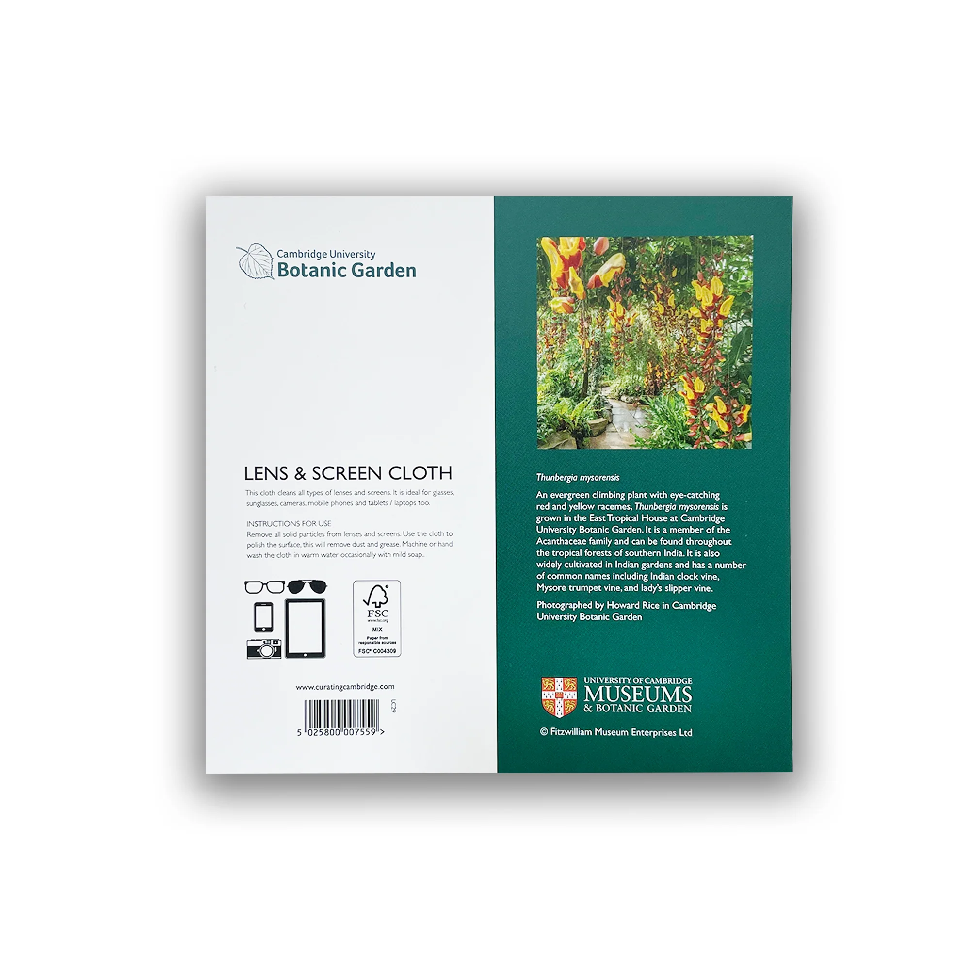 Thunbergia mysorensis, also known as the Indian clock vine and trumpet vine, grows in the tropical glasshouse of Cambridge University Botanic Garden. This handy screen and lens cloth, suitable for use on glasses, camera and phone lens, and more, makes the most of the bright fiery colours of the vine's flowers.Â