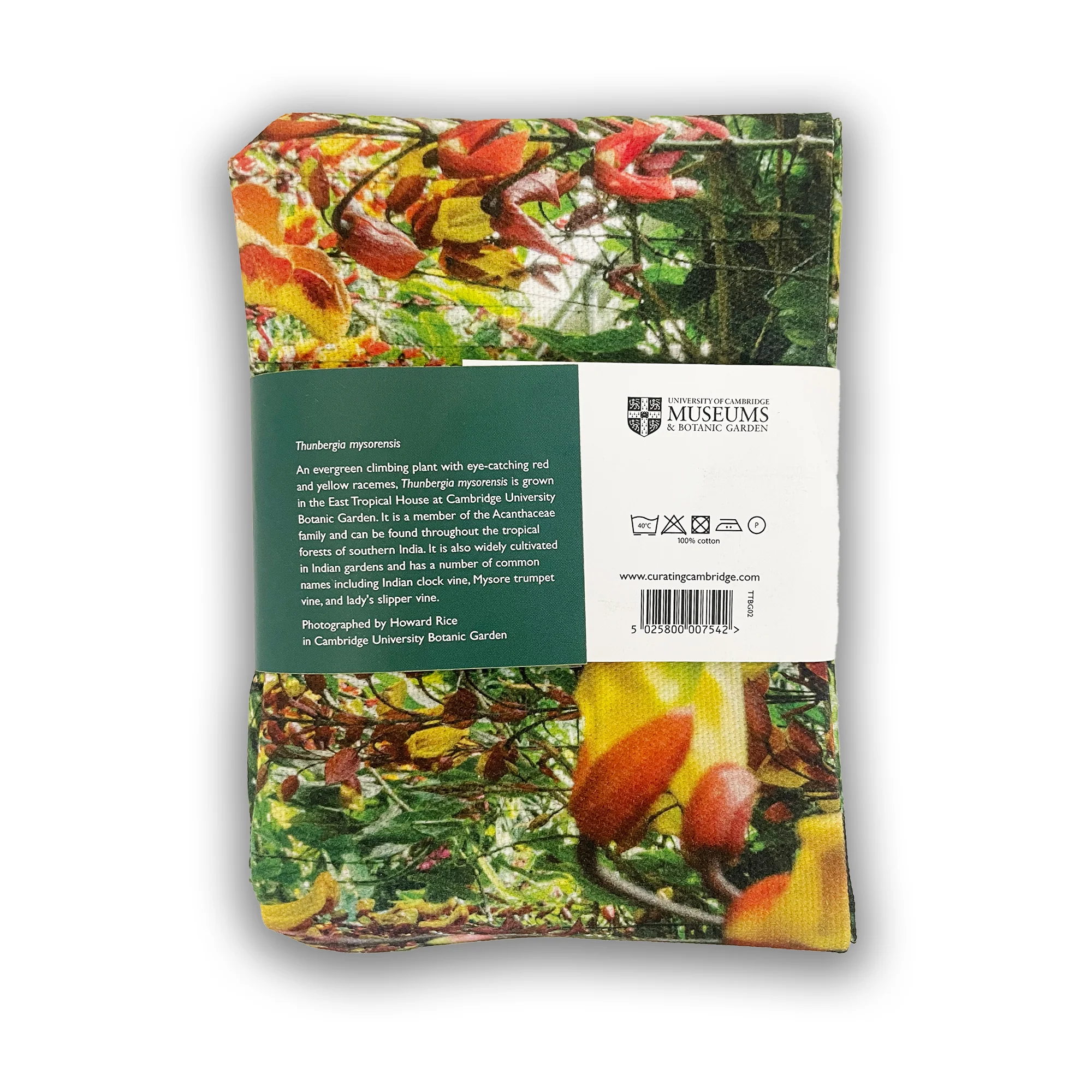 Thunbergia mysorensis, also known as the Indian clock vine and trumpet vine, grows in the tropical glasshouse of Cambridge University Botanic Garden. This handy screen and lens cloth, suitable for use on glasses, camera and phone lens, and more, makes the most of the bright fiery colours of the vine's flowers.Â