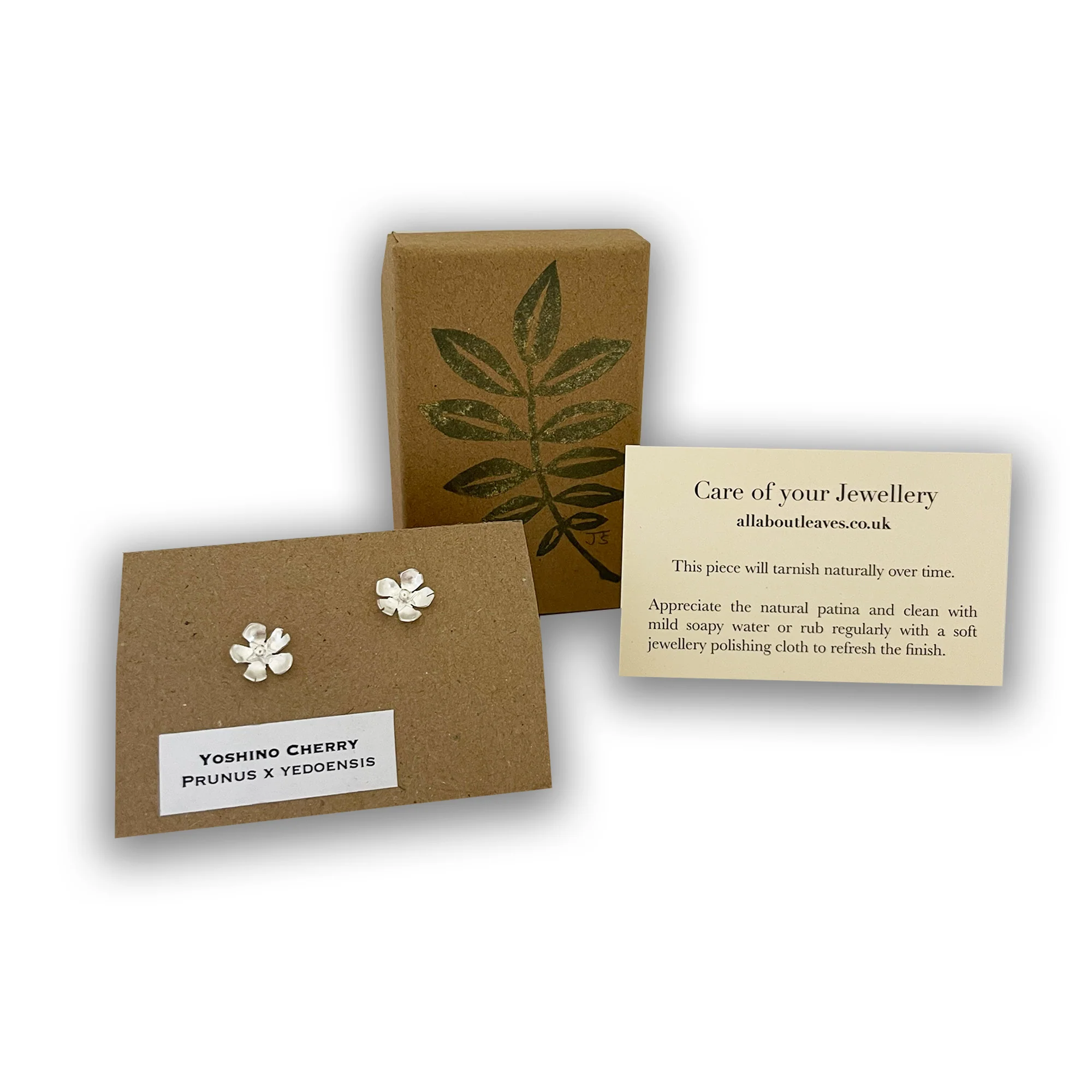A pair of handcrafted sterling silver earrings, made by a local Cambridge artist and jeweller Jane Thewlis under the name 'All About Leaves.' These studs are inspired by the Yoshino cherry, one of the most popular and iconic trees at Cambridge University Botanic Garden. Every spring the tree bursts into flower, covered in a multitude of beautiful white blossoms.